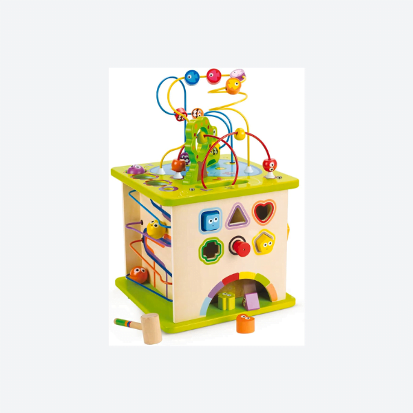 - HUB OF ACTIVITY: This sort and discover activity play cube consists of five sides. Watch them enjoy the beaded adventure land, a shape sorter, a stand in a queue, a turnplate and tap to the bottom activity